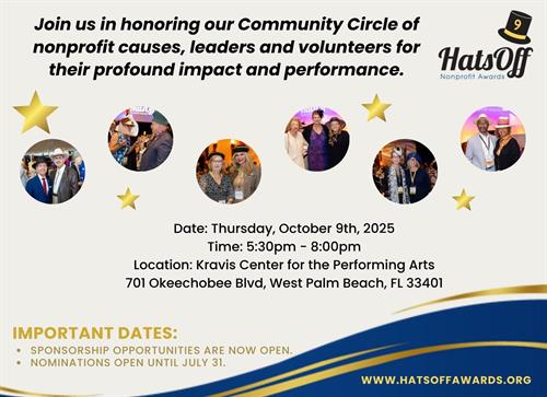 The Hats Off Nonprofit Awards has grown into one of the most anticipated nights of camaraderie and recognition in Palm Beach County. Join as we take our Hats Off to congratulate the most accomplished organizations and leaders of the year. We come together to honor Palm Beach County nonprofit organizations, staff and volunteers who lead positive change in our community.